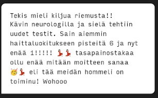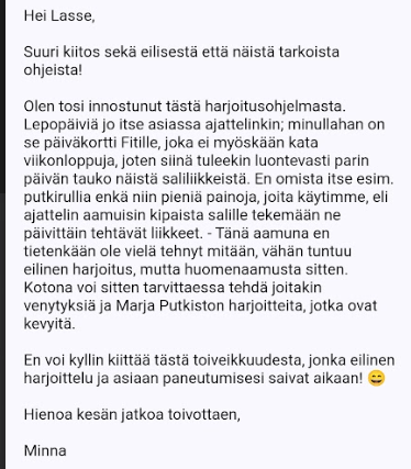 On ollut hienoa, että Lapuan OleFit tarjoaa yksilöllisiä palveluita, jossa ihminen otetaan yksilönä vastaan ja onnistutaan räätälöidyn ohjelman avulla, kun monesti on käynyt niin, että fysioterapiapalveluissa noudatetaan vain yksiä tiettyjä oppikirjamaisia harjoituksia, joiden mukaan menetellään. Ne eivät omalla kohdalla tuottaneet tulosta.