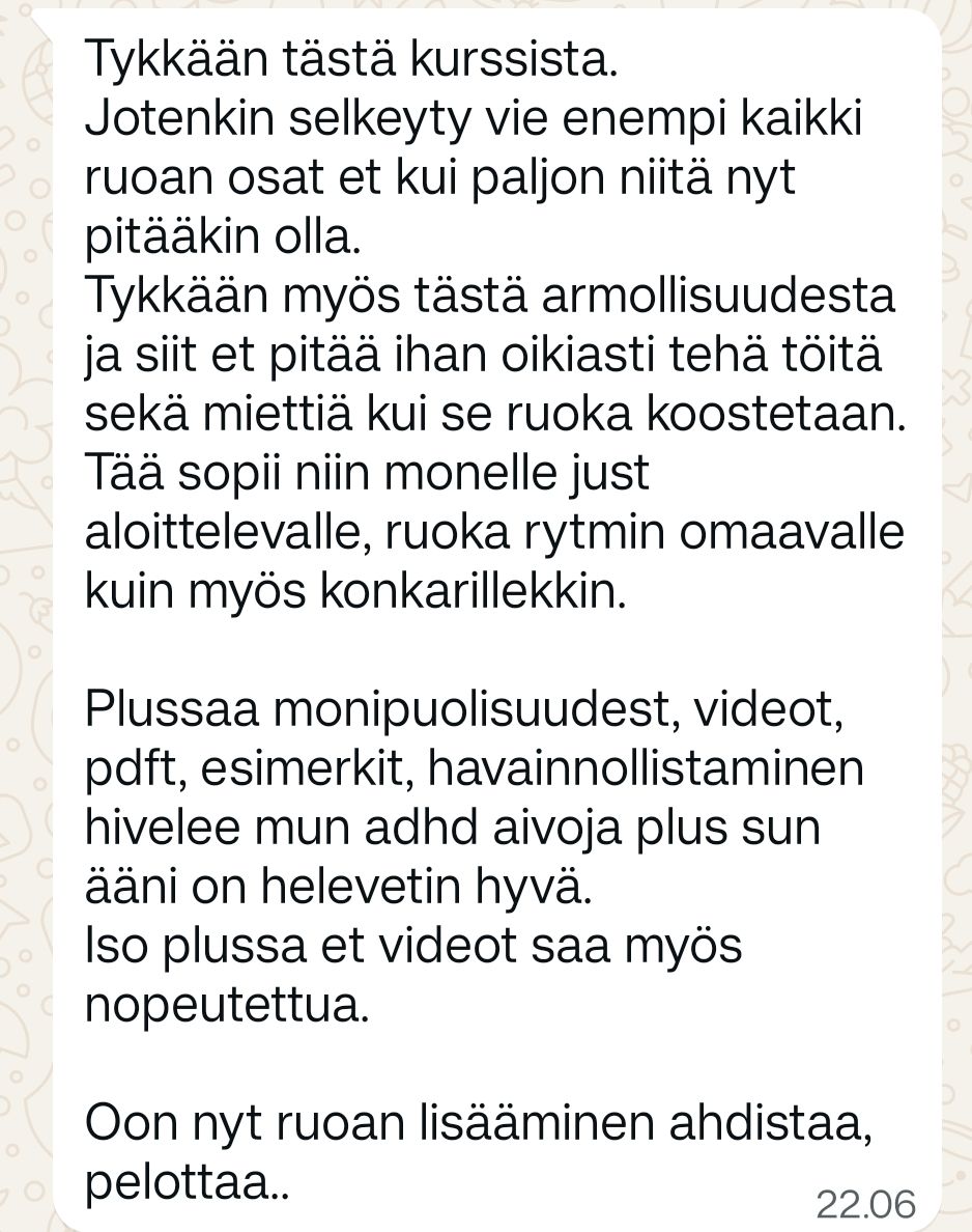 Ulkonäköpaineet ja dieetit alkoivat jo nuoruudessa ja on vielä selvästi aikuisiällä, ei uskalleta syödä. Hieman on ylipainoa tämän tarinan päähenkilöllä kaikesta huolimatta. On jo hormonitoiminnan häiriöitä ja käyntejä terveydenhuollossa asiasta. Mutta kun puuttuu yhä se toimintamalli ja varmuus, että miten. Tehtiin hänelle oma, tähän annospohjaan perustuva, ruokarunko. Ei siinä taidettu kahta viikkoa hommaa toteuttaa, kun viestiä tuli, että nyt on koko ajan nälkä ja mehän lisättiin vettä myllyyn! Alkuun tuntui ateriat isolta, mutta nopeasti tämä ahdistus vaihtui hyvään ruokahaluun. Prosessi on vielä kesken, aika näyttää montako kertaa ruokaa vielä lisätään ja ei, ei ole grammakaan tullut lisää rasvaa! Paino nousee kyllä tässä kohtaa, ihan vaan, koska siellä elimistössä on enemmän tavaraa ja lisääntynyt hiilihydraatti sitoo myös vettä. Ei mitään tekemistä minkään lihoamisen kanssa ja tässäkin tapauksessa, emme seuraa vielä painoa ollenkaan. Tarkoitus ei ole vielä ensinkään keskittyä painonlaskuun, koska ei siihen ole oikein mitään mahdollisuutta. Tottakai paino laskisi, jos vaan syötäisiin entistä vähemmän ja samalla saadaan se aineenvaihdunta entistä enemmän suohon. Tyhjästä on huono nyhjäistä - sopii tähän. Kun keho ja mieli on palautunut ja ruokaa on ollut oikeasti jo riittävän kauan riittävästi, niin sitten palataan siihen painonpudotukseen.
