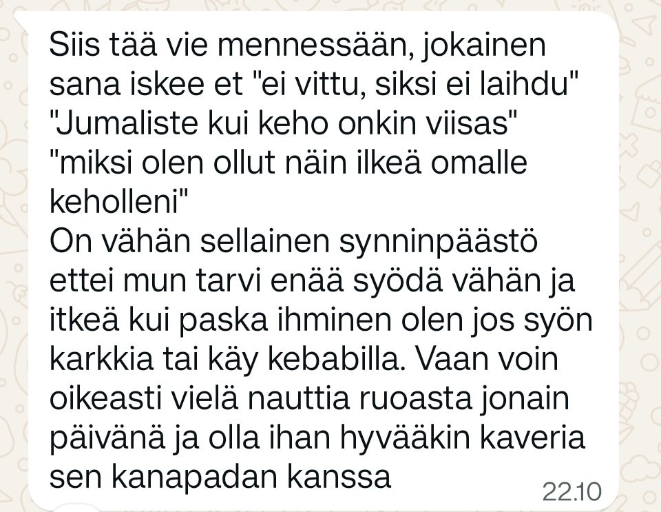 - Kaikki "ohi" syöminen tuo syyllisyyttä tai jopa ihan normaali ateria, jos se sisälsi jotain "väärää".