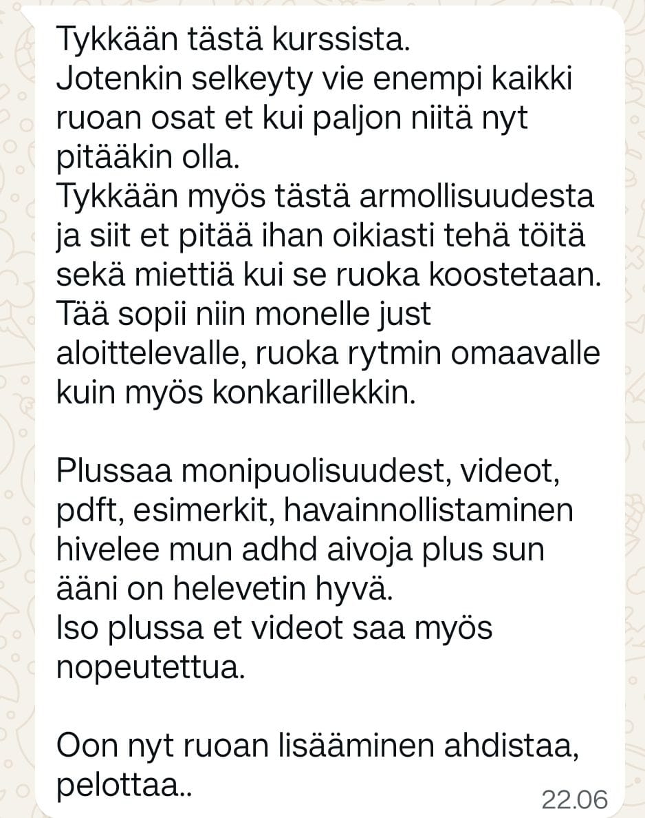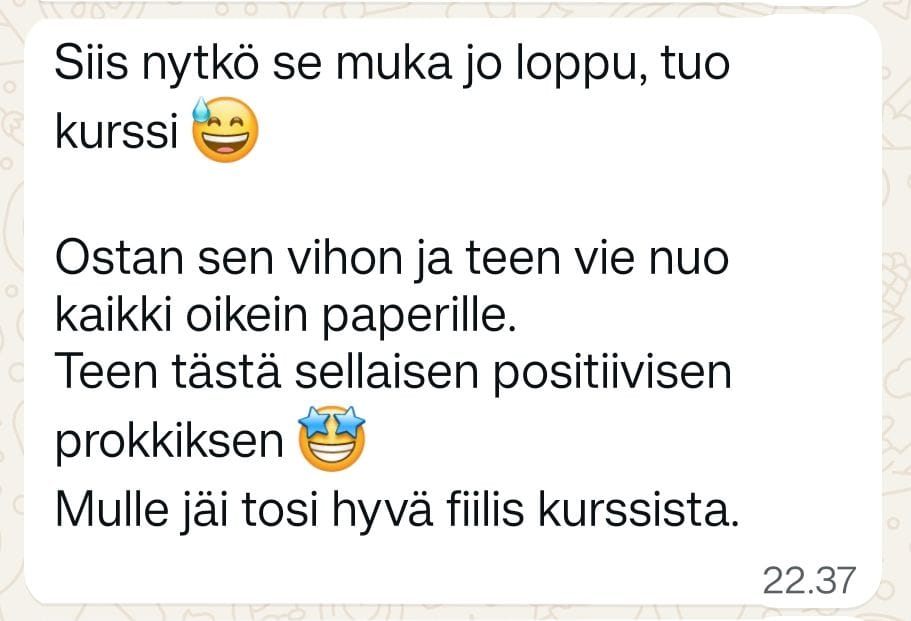 Jos epäilyttää kurssin sopivuus tai sisältö, niin siirry tästä yhteydenotto lomakkeelle ja laita mulle viesti, mikä tuntuu isoimmalta haasteelta!