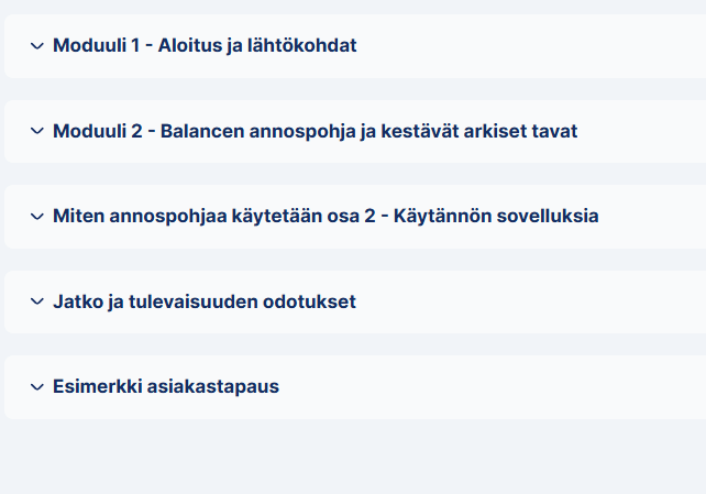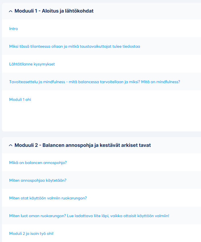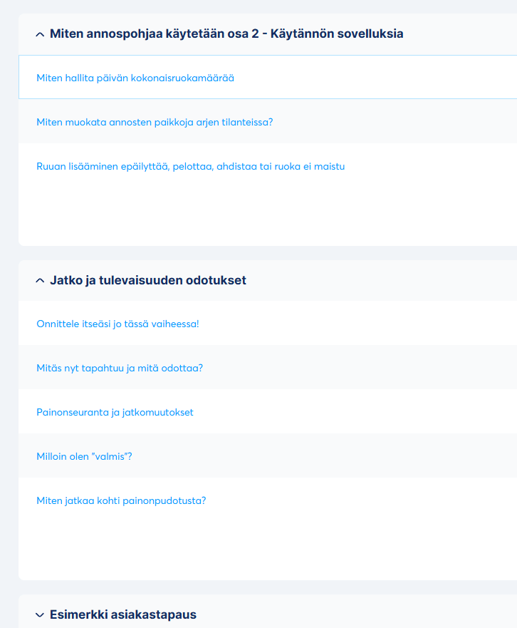 Kurssin sisällysluettelosta näet myös, että vasta kurssin lopussa puhutaan jotain painonseurannasta. Unohda se painoa alussa kokonaan, jos se siitä on muodostunut sinulle paine.